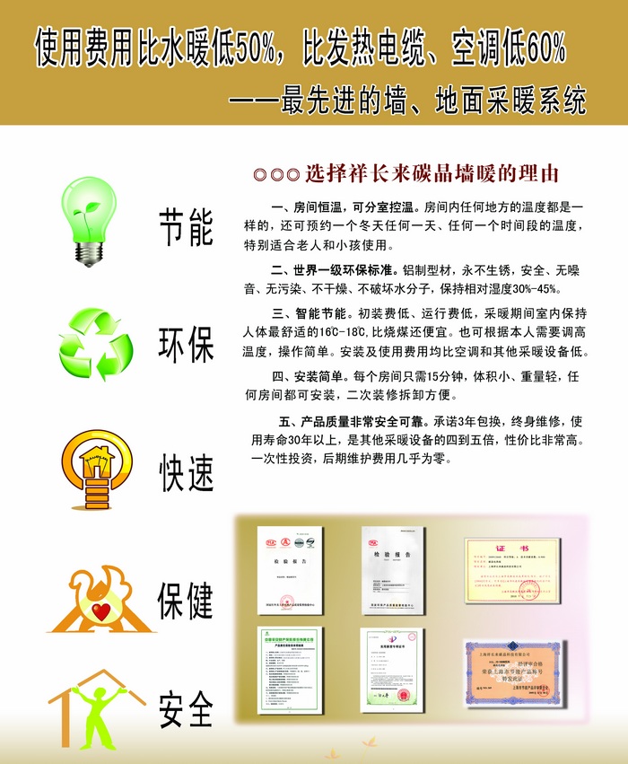 1 省电省钱: 热效率高,电热转换率98%以上,使用费用比水暖低50% 比空调低60%
