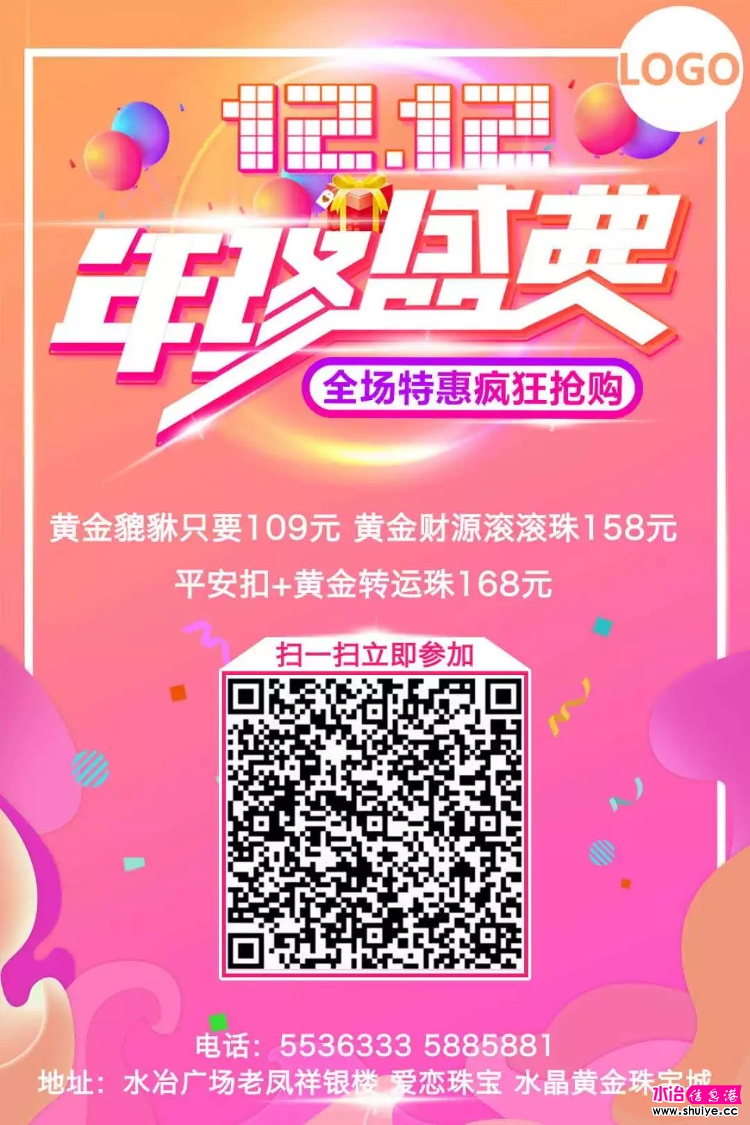 | 双12珠宝盛宴正式开启,如果你错过了双11,那一定不要放过双12,水冶宝盛珠宝全场首饰任性降价。砍价活动火爆来袭! 活动一:全场黄金首饰价格直降12元+12元 活动二:彩金首饰、钻石首饰全场满100元直减12元+12元 活动三:银饰买一送一(买银手镯送银项链) 活动四:国产名表买一送一 活动时间:2017年12月9日-2017年12月12日 地址:老凤祥银楼(水冶广场) 爱恋珠宝(交通宾馆楼下) 水晶黄金珠宝城(水晶生活购物广场一楼) 电话:5536333 5885881 |