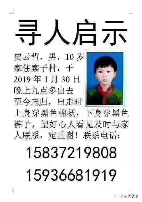 请点击上面,关注我们! 贾云哲,男,10岁,家是寨子村,与昨天晚上九点多出去至今未归,出去时上身穿黑色棉袄,下身穿黑色裤子,望好心人看见与家人联系 联系电话15837219808 联系电话15936681919 |